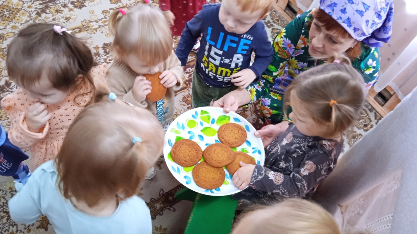 ????В гостях у бабушки малыши вместе с бабушкой испекли вкусные оладушки.