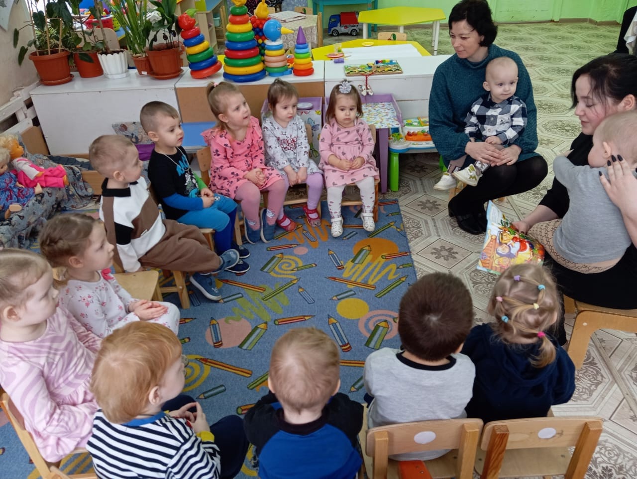 В гости к ребятам первой младшей группы "Теремок" пришла мама Ромы, Дарья Владимировна. Пришла она не просто так, а с книжкой сказок. Читать для детей очень важно в любом возрасте, особенно в раннем. Чтение художественной литературы в раннем возрасте играет важную роль в речевом и личностном развитии ребёнка. Сказка "Репка", в исполнении мамы, стала приятным сюрпризом для детей. Они не только внимательно слушали но и помогали рассказывать сказку. Танец "Пальчик о пальчик... " для мамы и совместный рисунок стали подарком для Дарьи Владимировны.