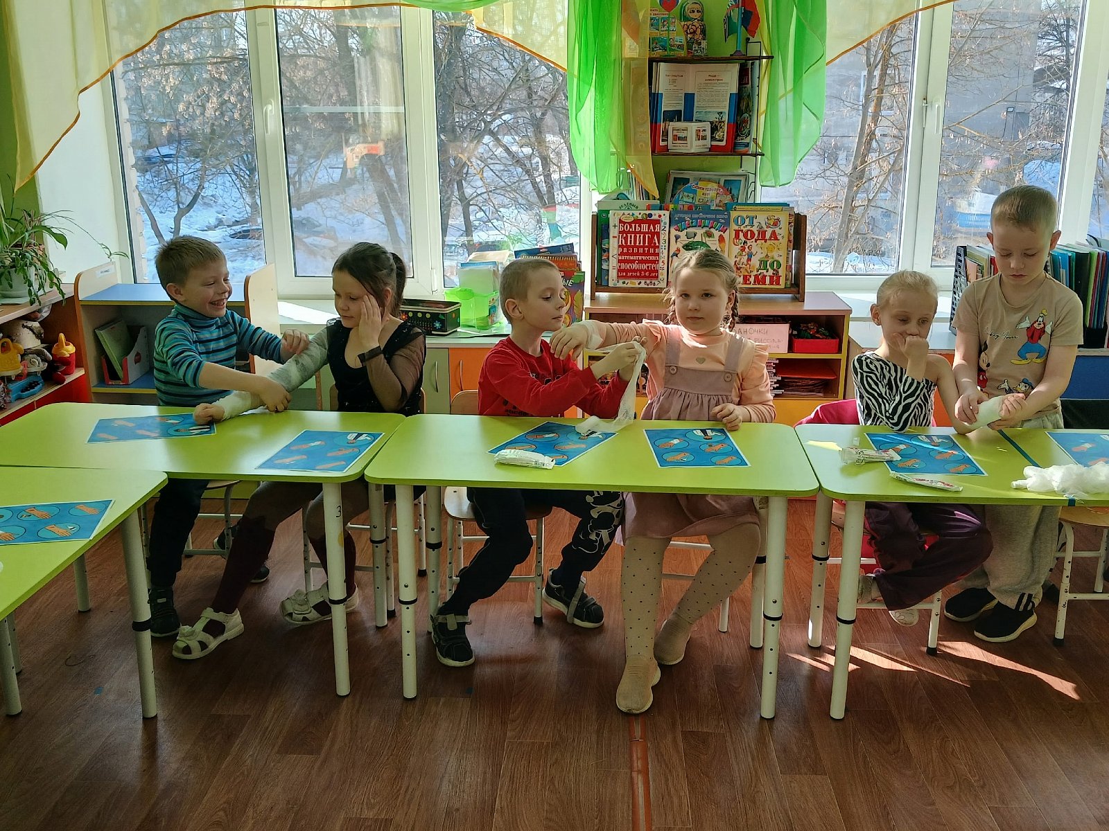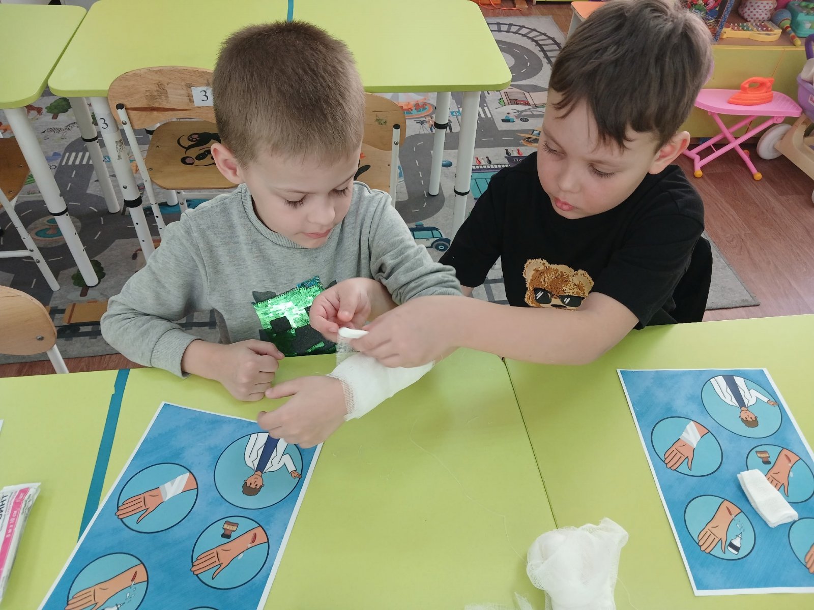 Во время практической части все ребята примерили на себя роль медицинского работника и с большим удовольствием научились оказывать первую медицинскую помощь.
