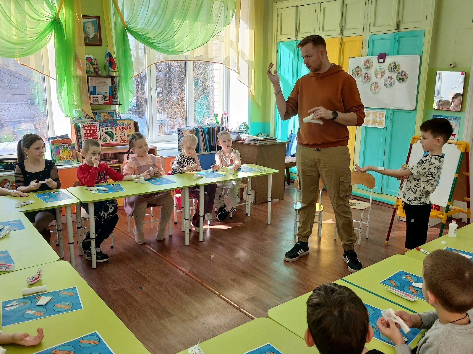 Он рассказал о профессии медицинского работника, о том как долго и тщательно нужно учиться, чтобы стать профессионалом своего дела. Беседа прошла в форме вопрос-ответ, где ребята активно интересовались профессией фельдшер. Гость группы специально для ребят разработал и провел провел мастер-класс по оказанию первой помощи при порезах и ссадинах. Алексей Владимирович рассказал, как правильно обрабатывать раны, и наглядно показал, как их нужно забинтовывать.
